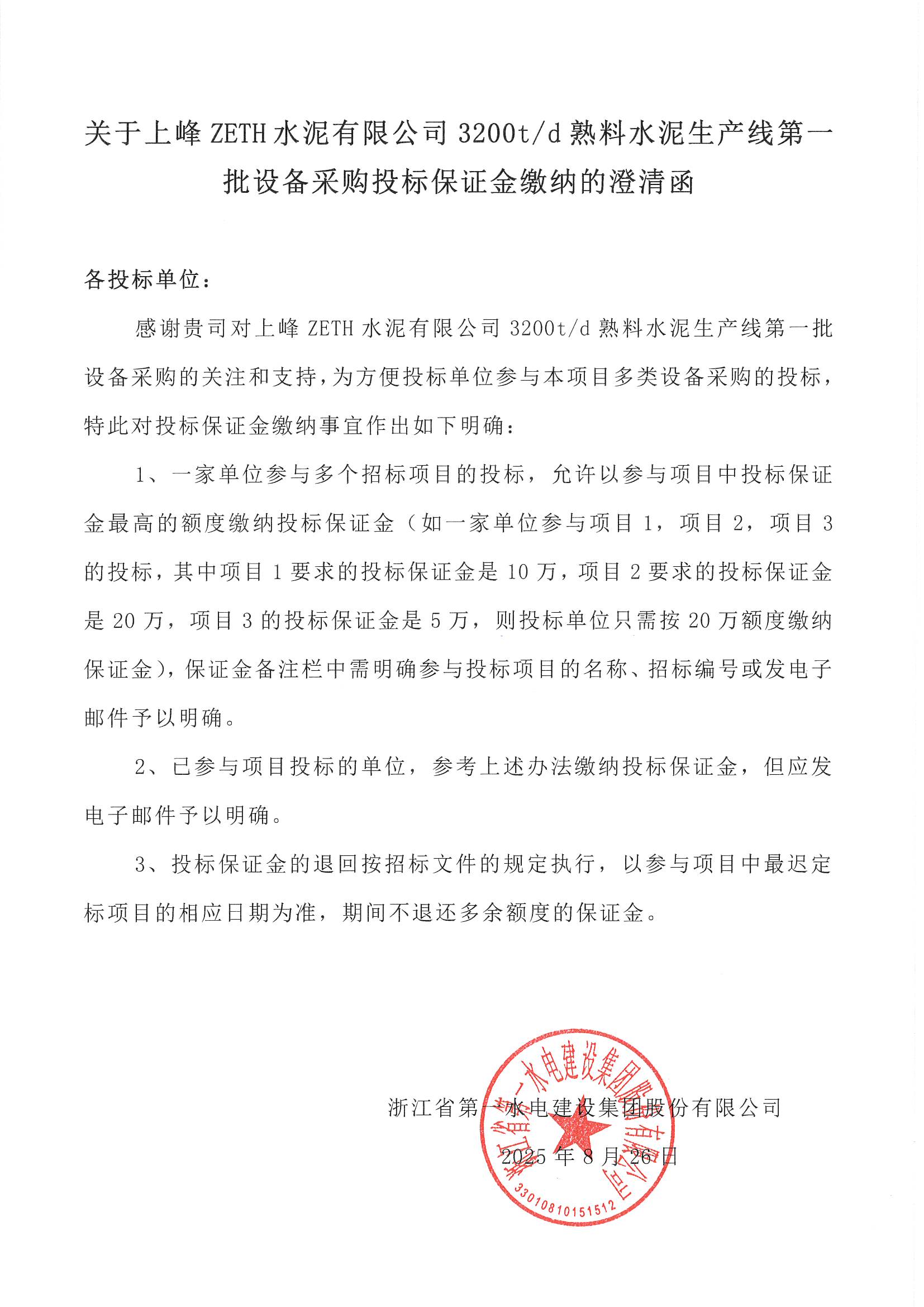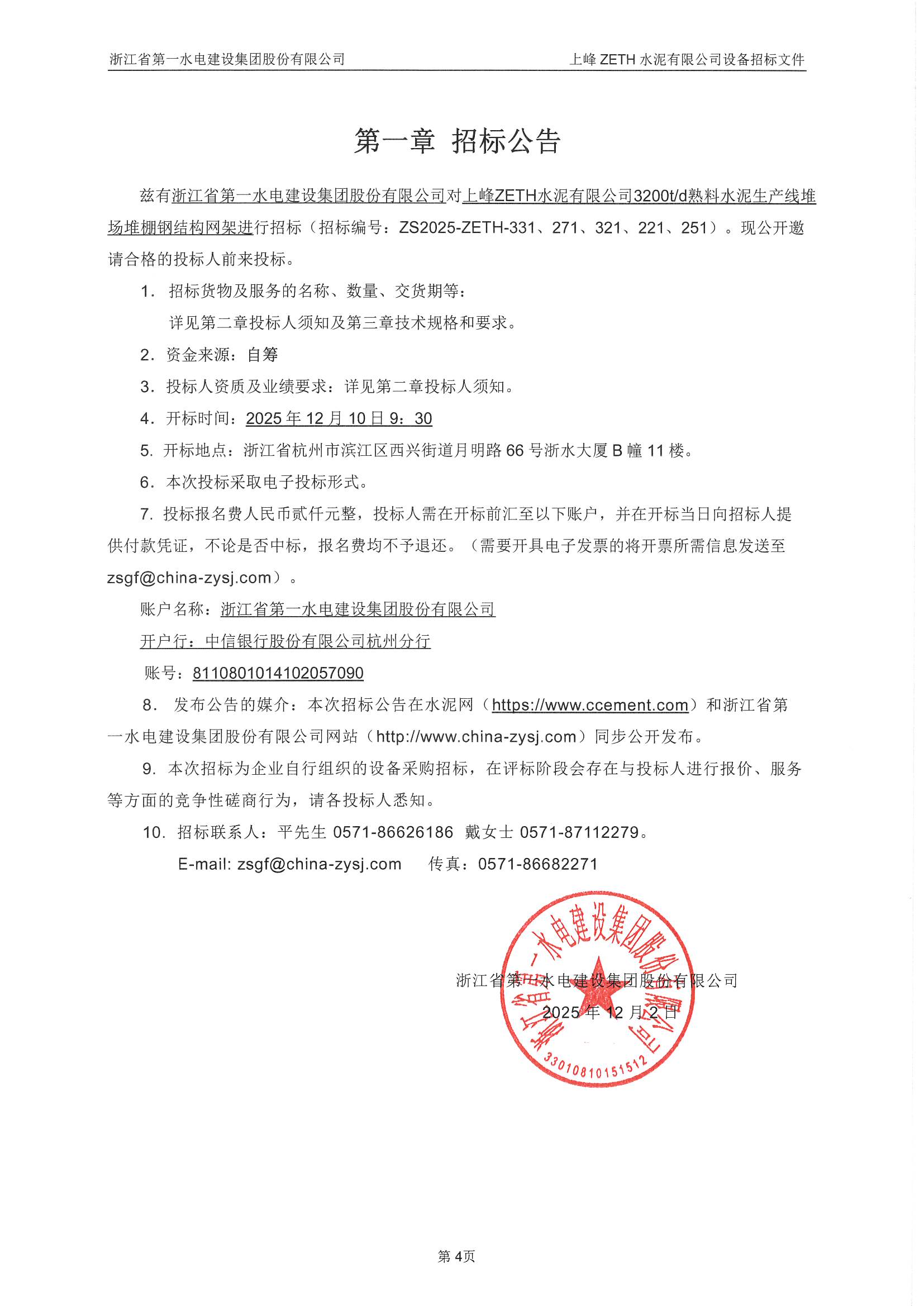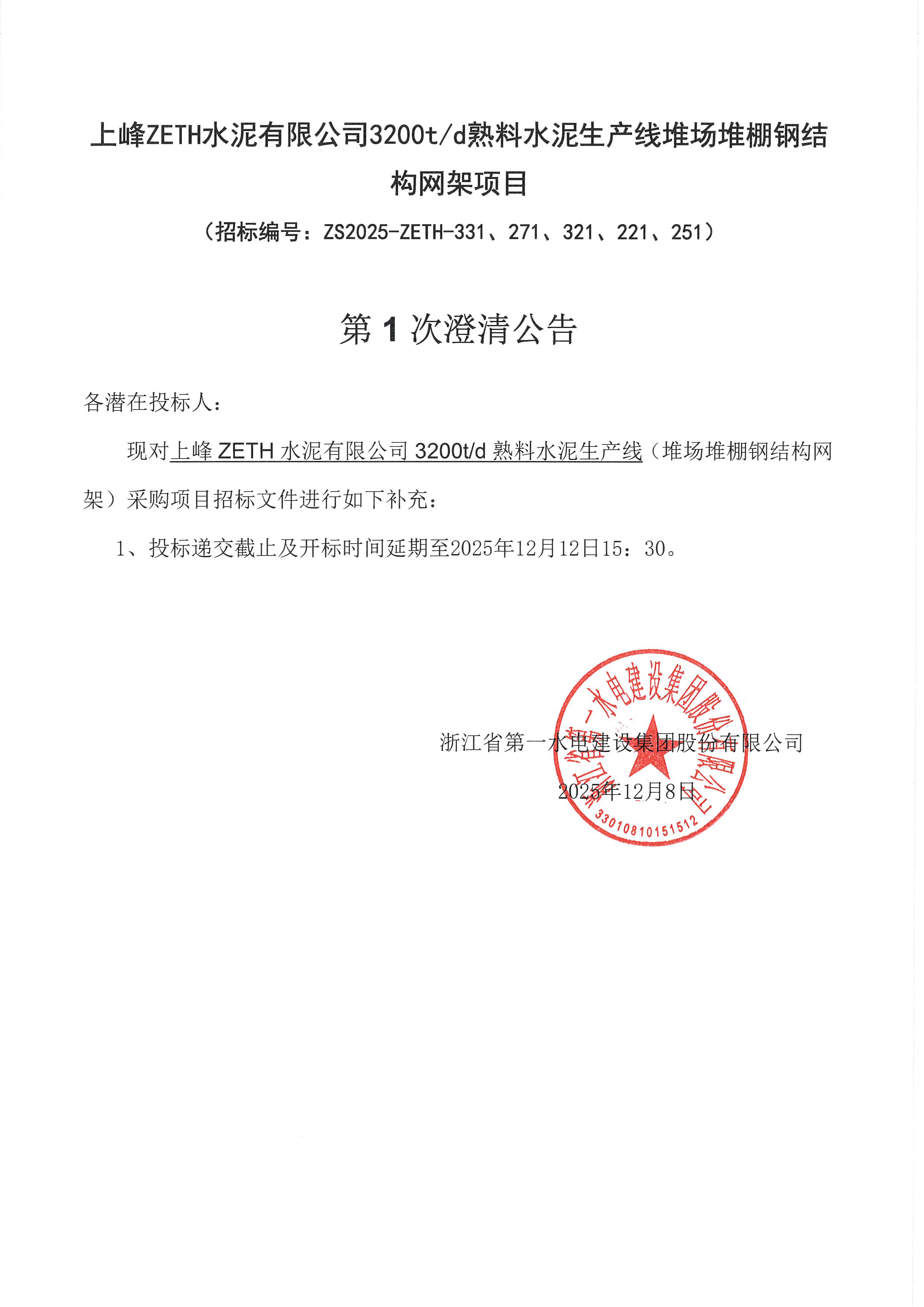 上峰ZETH水泥有限公司3200t/d熟料水泥生產(chǎn)線堆場(chǎng)堆棚鋼結(jié)構(gòu)網(wǎng)架項(xiàng)目第1次澄清公告